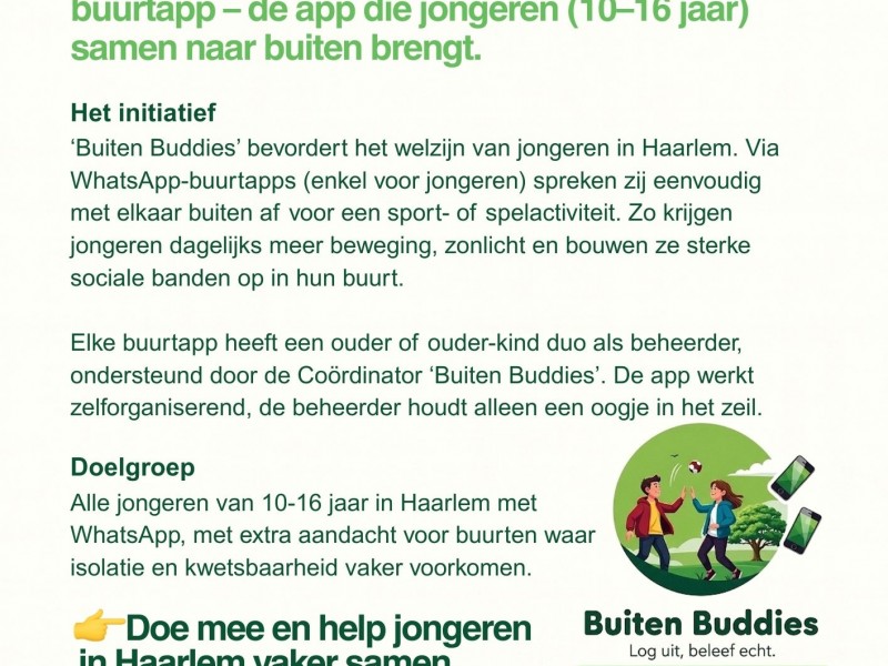 Buiten Buddies is een WhatsApp-buurtapp voor jongeren van 10–16 jaar. De app is bedoeld om eenvoudig buitenspeelafspraken te maken – het is geen chatgroep. Zo maken we buitenspelen weer laagdrempelig, cool en vanzelfsprekend in de buurt.