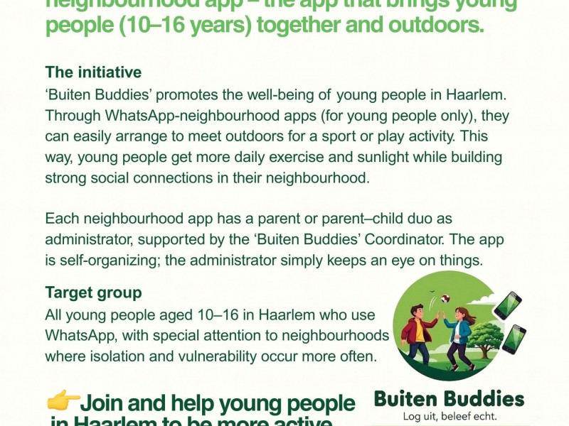 Buiten Buddies is een WhatsApp-buurtapp voor jongeren van 10–16 jaar. De app is bedoeld om eenvoudig buitenspeelafspraken te maken – het is geen chatgroep. Zo maken we buitenspelen weer laagdrempelig, cool en vanzelfsprekend in de buurt.